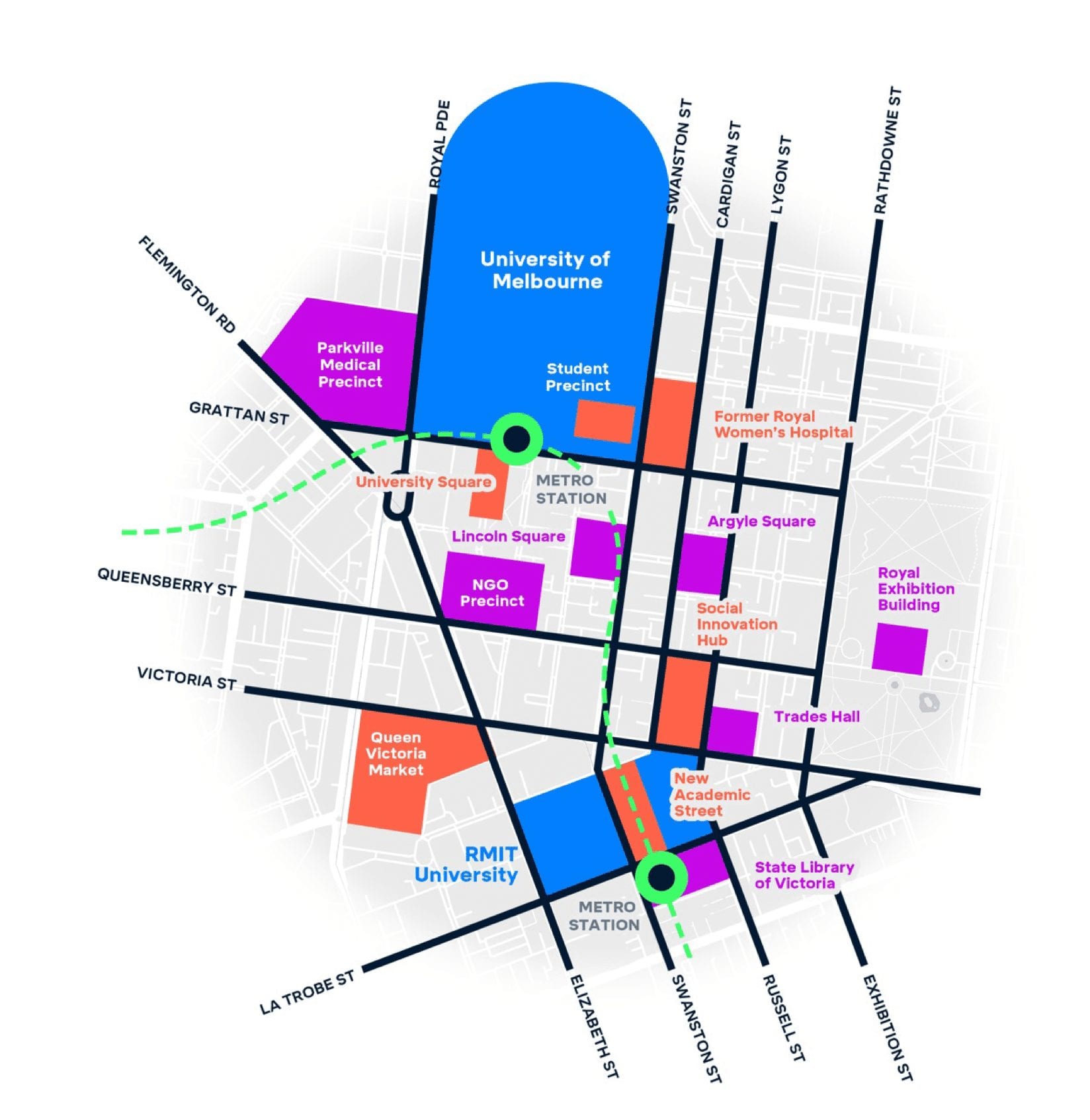 The initial focus for the founding partners, is to catalyse an urban innovation district in the area immediately north of Melbourne’s CBD – an area in which many of Victoria’s formative institutions are clustered, including the central campuses of RMIT and the University of Melbourne, Queen Victoria Market, State Library of Victoria, Royal Exhibition Buildings, Parkville Biomedical Precinct and Melbourne Museum.